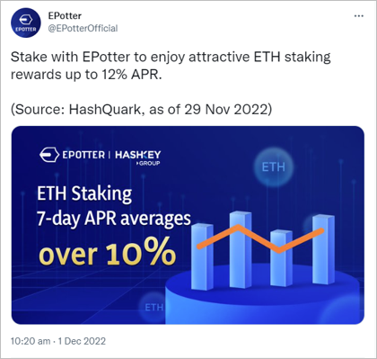 The 7-day average APR of ETH liquid staking on EPotter, an institutional-grade Proof-of-Stake validation service by HashKey Group, has reached over 10%!